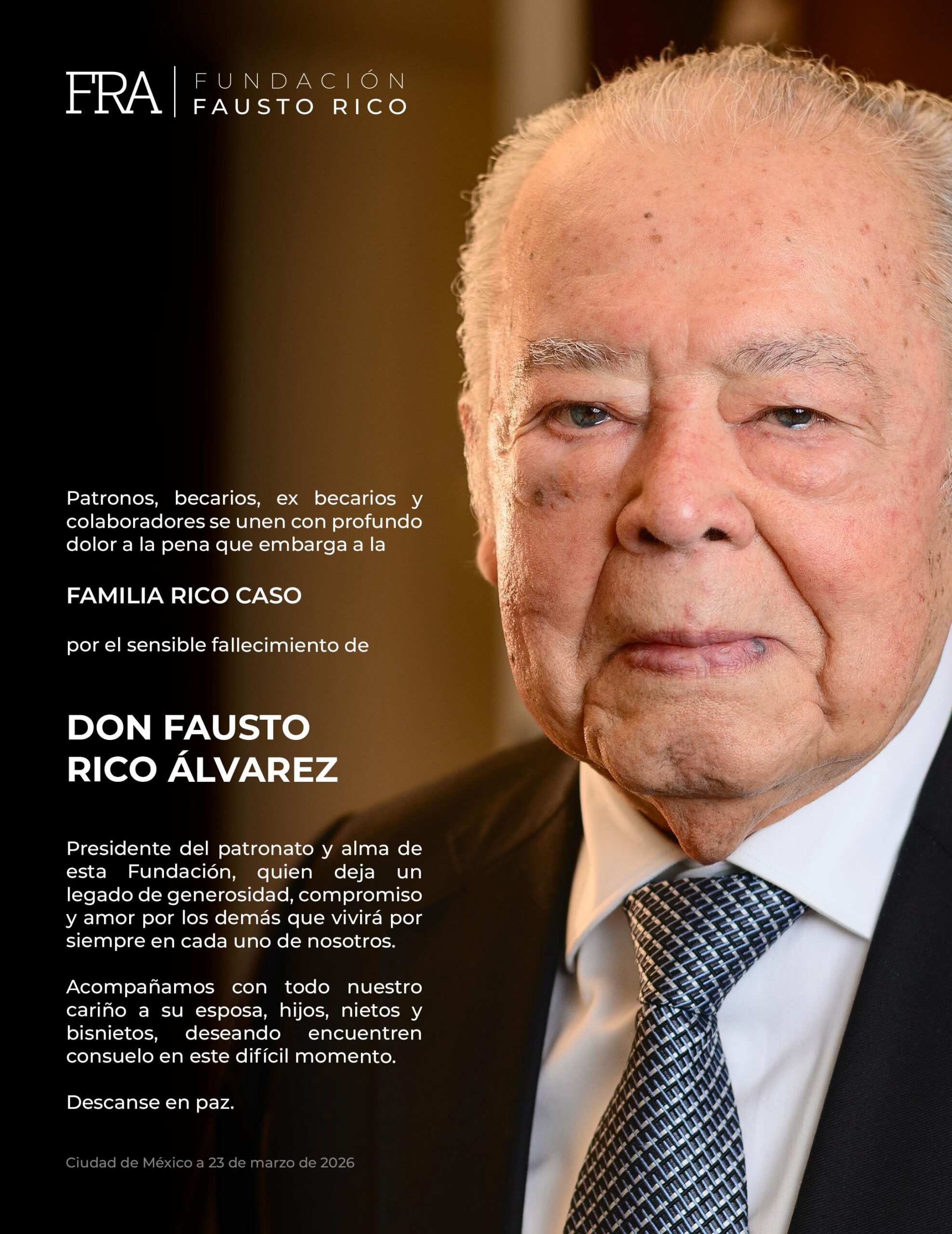 El nombre de don Fausto Rico Álvarez resuena en las aulas y las instituciones jurídicas de mayor prestigio en México. Su voz habita las páginas de una vasta obra académica y se ha vuelto referente en el estudio del Derecho civil, convirtiéndose en una fuente obligada de consulta para las generaciones de civilistas que lo suceden. Su quehacer profesional marcó un antes y un después en el mundo notarial, donde no sólo actualizó la profesión sino que también hizo escuela y generó terminología que a la fecha sigue siendo utilizada. Su visión ética y su apoyo a la educación fueron la base para la creación de la fundación que, cobijada por su nombre, respalda económicamente a estudiantes destacados, pero de escasos recursos económicos, para que continúen sus estudios en importantes instituciones académicas.